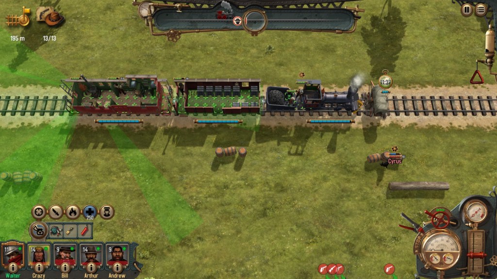 Bandits are a complete annoyance in Bounty Train. I’ve found either the encounters to be easily handled or completely overwhelming. What I was led to think was tactical combat, consists of positioning your gunfighters so the one you want to be shot at the most is in front while the rest of your team lazily returns fire. Your crew can’t leave the train which means every shot that misses them is a shot you’ll have to pay to repair later. Plus your train carriages occasionally burst into flames. If an enemy has explosives, you best pray your fighters aren’t in a cargo carriage or the engine. Under the best of circumstances, your repair costs will be a significant portion of what the bandits were demanding in order for you to pass unmolested, plus a pile of time wasted.