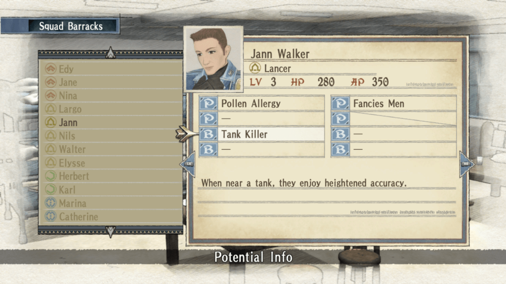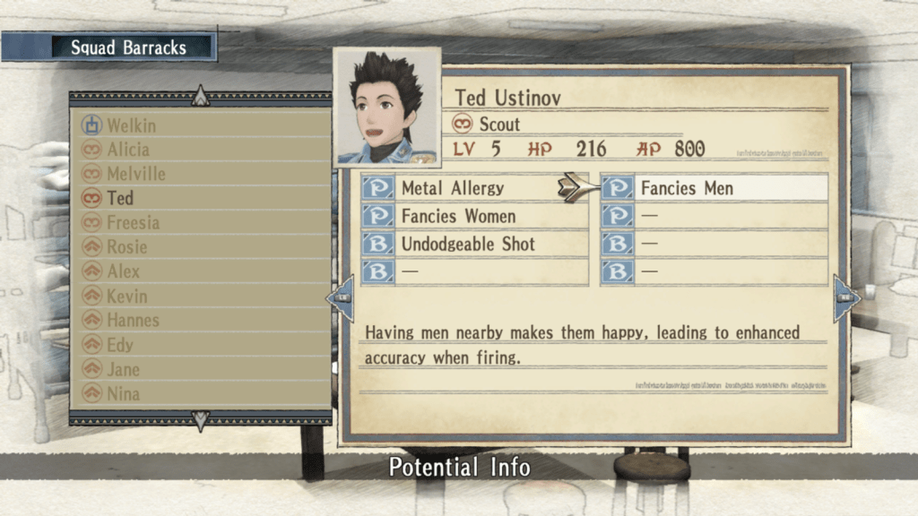 All of the squad members you pick up have attributes. Ted’s attributes caught me completely off guard. He has three. The third I cannot remember because the first two are Fancies Women and Fancies Men. Ted is bisexual. This revelation had me digging through the roster to find other queer folks. I quickly found Jann, a lighthouse of a man who’s an anti-armor specialist. From that point on started building my squad off of random romantic pairings. War may be hell, but in my playthrough of Valkyria Chronicles, it’s also hella gay.